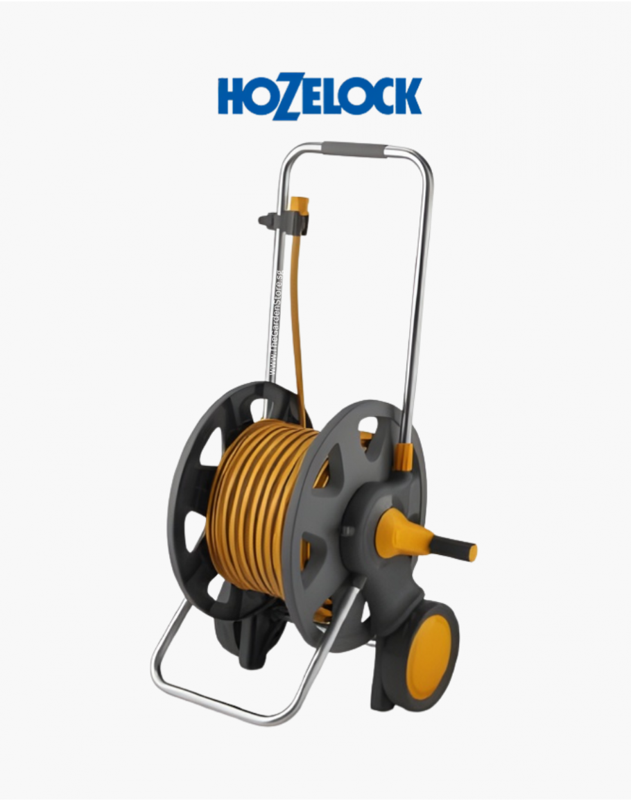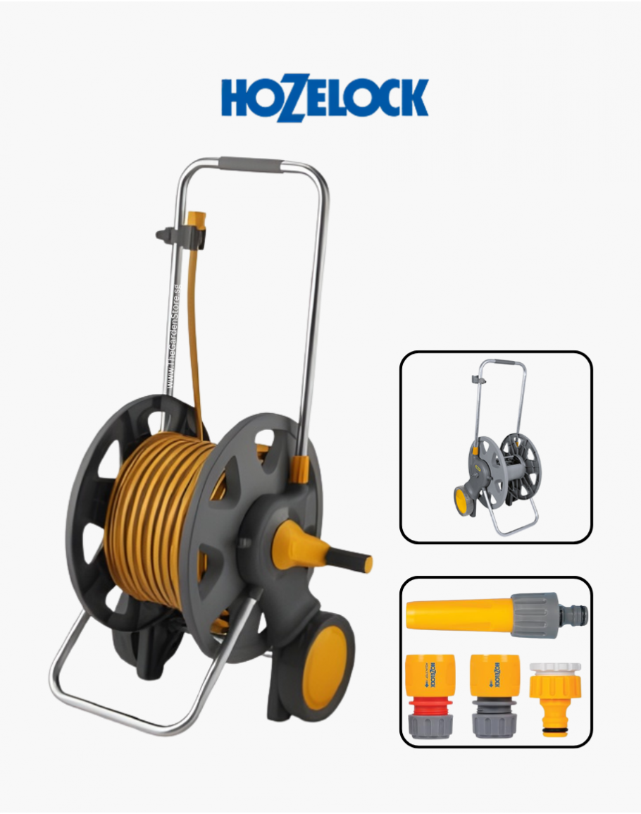 Hozelock Hose Cart with 50m Ultra Hose & 2353 fitting set. Wheeled, easy-rewind, tidy storage and ready-to-use connectors for effortless, tangle-free garden watering.